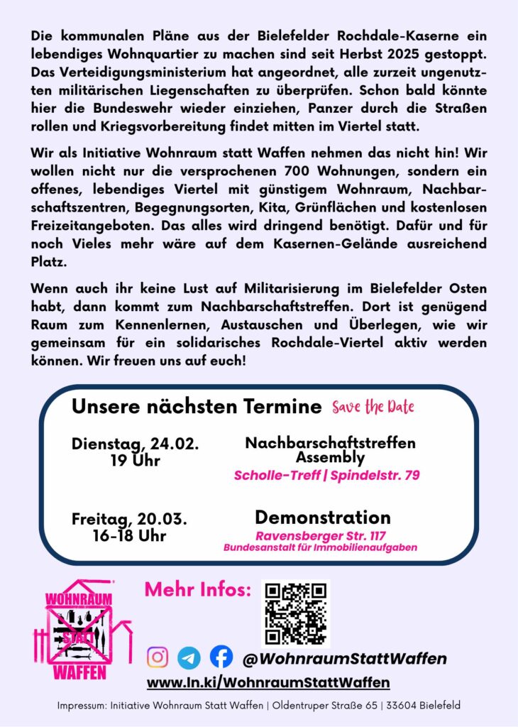Der Bielefelder Appell für den Frieden (zu finden unter: bielefelder-friedensini.de) möchte genau diese Initiative unterstützen und in unserer Stadt Dialogebenen schaffen, um Menschen, die von Krieg und Gewalt betroffen sind, in Bielefeld Stimme zu geben und Solidarität und Hilfe wachsen zu lassen.
