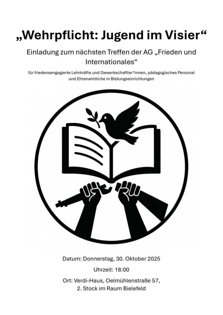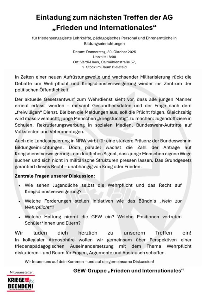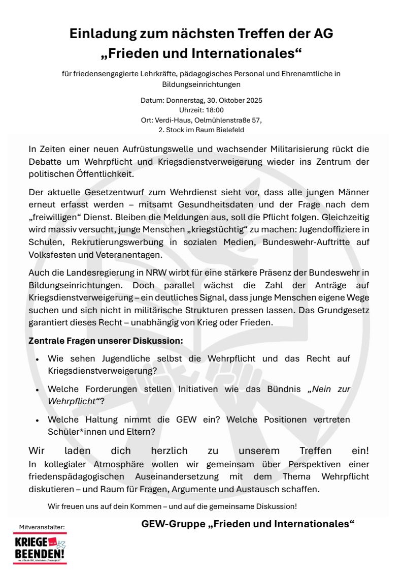 Die Friedensinitiative Bielefeld/OWL ruft zur Teilnahme an der bundesweiten Demonstration „Nie wieder kriegstüchtig! Stehen wir auf für Frieden“ am 3. Oktober in Berlin auf.
