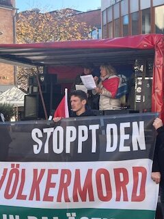 Rund 300 Menschen solidarisierten sich am Samstag um 11 Uhr mit den verzweifelten, hungernden und unversorgten Menschen im Gazastreifen. Die Redner:innen beklagten die massive Zerstörung, die zielgerichteten Angriffe auf Kinder, Journalist:innen und medizisches Personal.